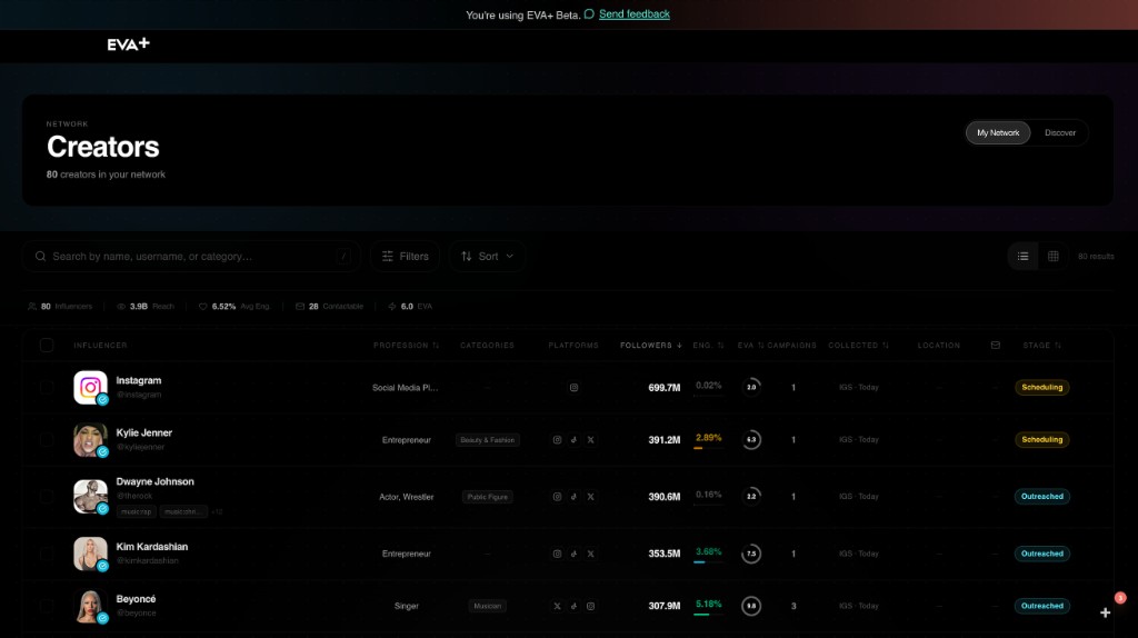 Click any creator to see EVA+ score them in real time